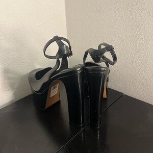 Elevate your style with these ASOS black platform shoes, featuring a sleek slingback design and a glossy finish. The platform sole adds height and comfort, making them perfect for formal occasions. With their classic pump silhouette and modern slingback strap, these shoes are a chic addition to any wardrobe.