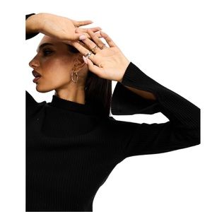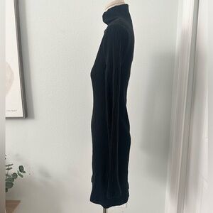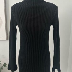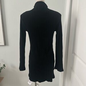 Chic black mini dress. Ribbed texture. Long sleeves. High neckline. Perfect for any occasion.