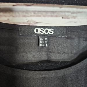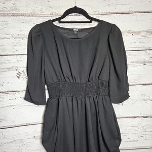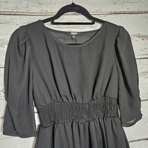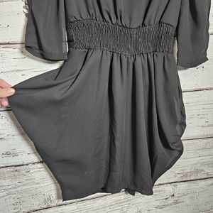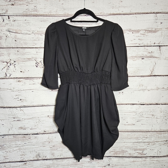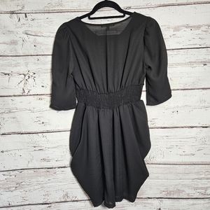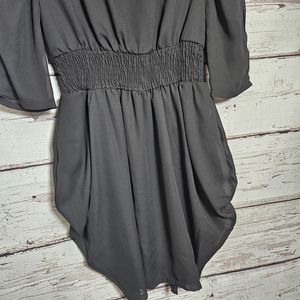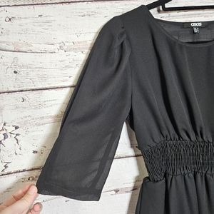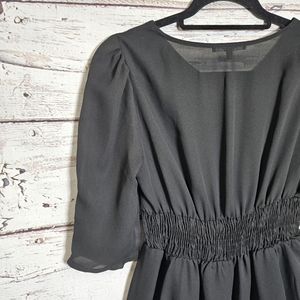 Elegant black dress with ruched waist. Features three-quarter sleeves. Perfect for any occasion.