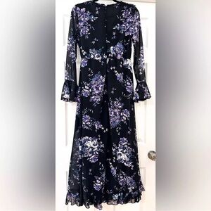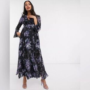 New without tags. ASOS Black Ruffle Trim Purple Floral Double Front Slit Maxi Dress. Size 4. Sheer sleeves, partially lined body. Low double slits in the front with ruffle trim. Ruffle trim at V-neck collar. Partial zip back. Can be worn as a maternity dress as well. So beautiful and perfect for Fall!