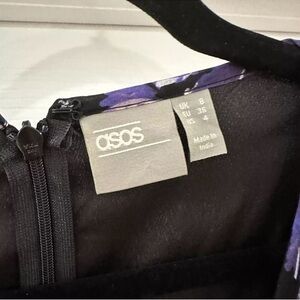 New without tags. ASOS Black Ruffle Trim Purple Floral Double Front Slit Maxi Dress. Size 4. Sheer sleeves, partially lined body. Low double slits in the front with ruffle trim. Ruffle trim at V-neck collar. Partial zip back. Can be worn as a maternity dress as well. So beautiful and perfect for Fall!