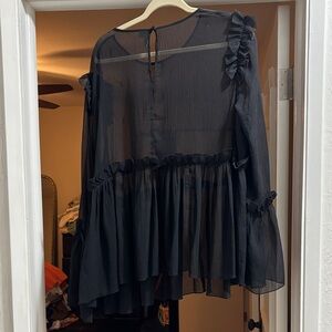 Chic black sheer blouse. Features ruffles and pearl embellishments. Ideal for stylish occasions.