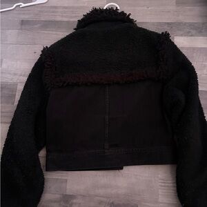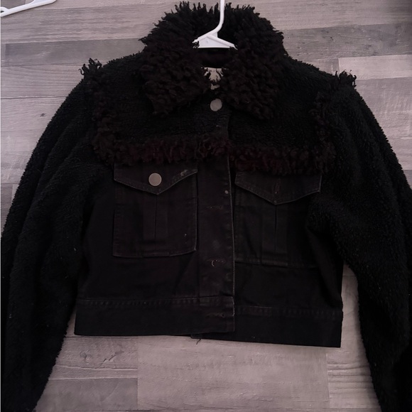 Stylish black jacket with textured design. Features buttoned front and pockets.