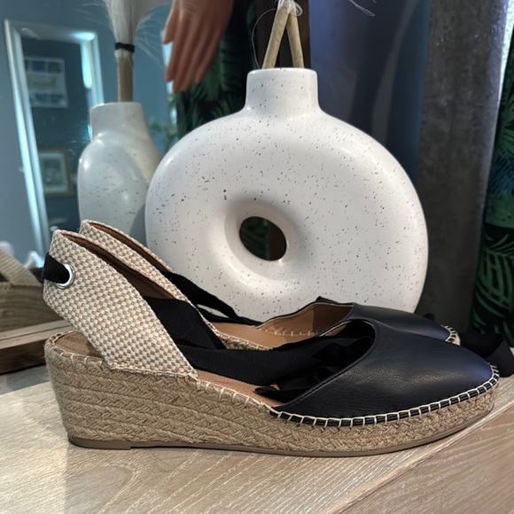 These ASOS espadrilles feature a chic black upper paired with a cream espadrille sole, offering a stylish contrast. The adjustable ankle strap provides a secure fit, making them perfect for casual summer outings.