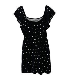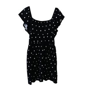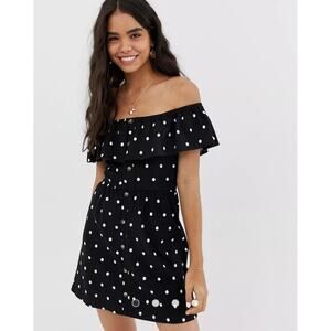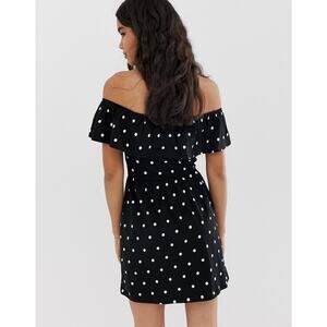 Chic black midi dress with white polka dots. Off-shoulder design. Perfect for casual outings.