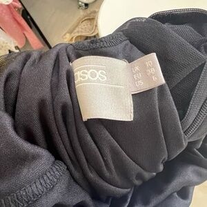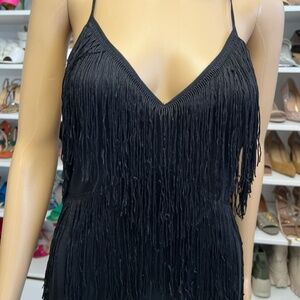 Shake it up in this adorable ASOS Black Fringe Flapper Style Dress with a plunging neckline and sheer net back covered with fringe, Midi Length. The dress has about 2” stretch