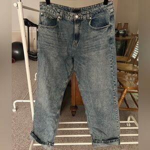 These ASOS boyfriend jeans in a classic blue hue offer a relaxed fit with a comfortable silhouette. Crafted from non-stretch denim, they feature a high-waisted design and a vintage-inspired wash. Perfect for casual outings, these jeans provide a laid-back yet stylish look.