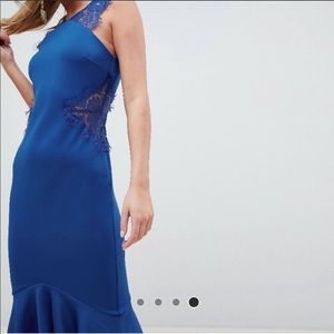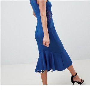 ASOS sexy Blue dress with lace accents and flare/peplum hemline. Size 6 ( worn once -some deodorant underarm marks-could use cleaned)
