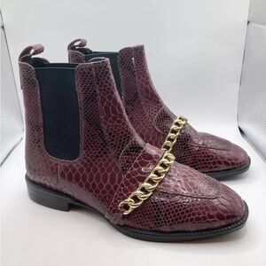 Sexy and fun red snake skin leather slip on boots. Gold chain across the almond toe. Low calf height. Flat heel. Dress up or casual with black leggings or leggings with a t-shirt and chunky necklace or blazer with clutch. Wore twice. Like new.