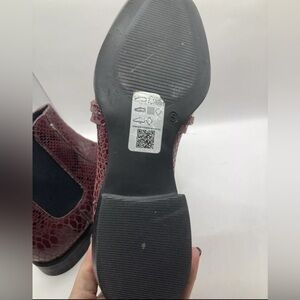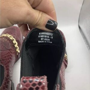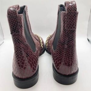 Sexy and fun red snake skin leather slip on boots. Gold chain across the almond toe. Low calf height. Flat heel. Dress up or casual with black leggings or leggings with a t-shirt and chunky necklace or blazer with clutch. Wore twice. Like new.