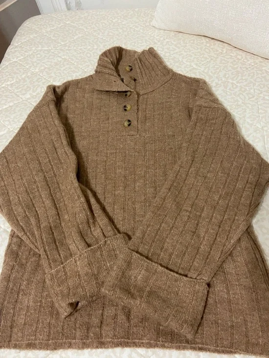 Cozy ribbed knit sweater with a button-front mock neck. Long sleeves with wide cuffs. Soft, warm fabric for everyday wear. Neutral brown tone pairs easily with jeans or skirts.