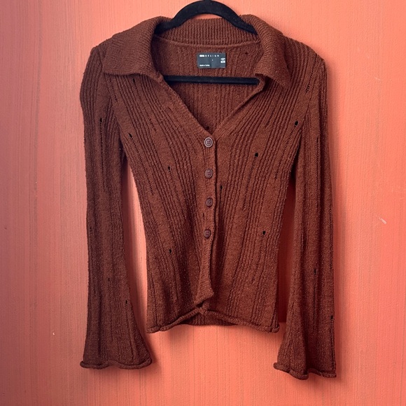 Stylish brown ribbed cardigan with button-up front and flared sleeves. Perfect for layering.