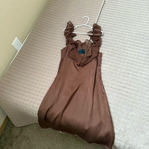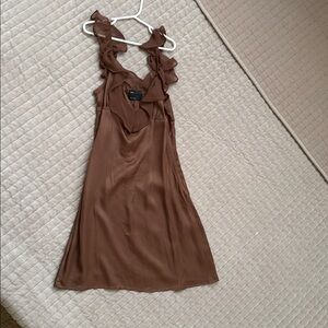 ASOS mini dress with soft ruffle neckline. Smooth satin-like fabric. Sleeveless for a breezy fit. Elegant warm brown tone.