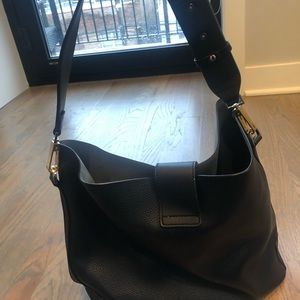 This bag is in almost new condition. Some staining on the inside, however leather on the outside is lightly worn and almost new. Extendable strap also attached! Great work bag or workout bag. Black with gold hardware