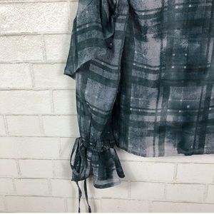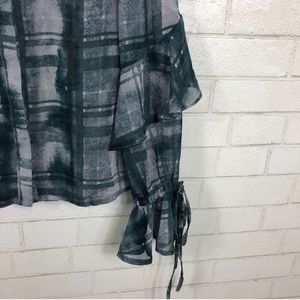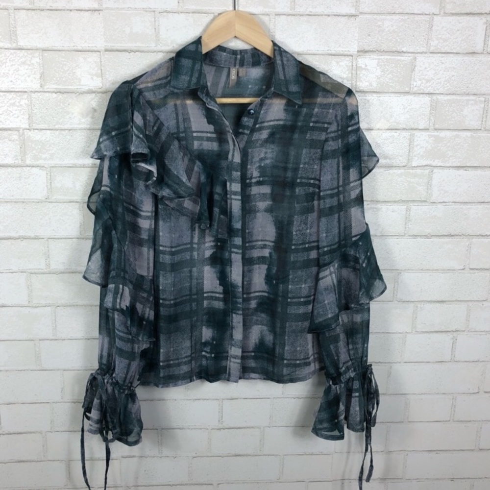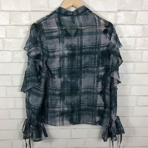 ASOS Button Down Blouse. Ruffle on chest and sleeves. Ruffle sleeve hems with tie. Hidden buttons down front. Semi-sheer fabric. Unlined.
