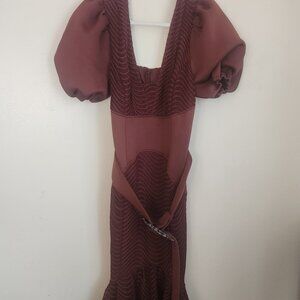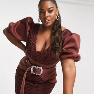 This beautiful ASOS cocktail wiggle dress is a stunning.Addition to your wardrobe It is in a beautiful brown color with a Rhinestone accentuated belt.It is a mermaid fit with a ruffled bottom and puff sleeves.It zips up in the back and his a size fourteen new with tags