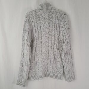 Keywords neutral light grey chunky cable knit pullover style turtleneck sweater fall warm cozy psl insta perfect lounge back to school college university campus dorm life sorority sister Greek life exaggerated collared neutral pullover style sweater hand knit country club