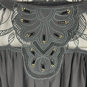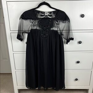 Stylish black mini dress with sheer sleeves. Features elegant detailing on the neckline.