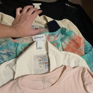 Elevate your wardrobe with this designer lot of five ASOS Club Monaco Peck Peck WeME tops and blouses. These pieces are perfect for the fashion-forward woman who loves to mix and match high-quality garments. Each top features unique details and vibrant colors, making them suitable for any occasion.