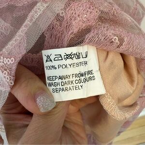 This beautiful pink lace sequin dress features long sleeves and a sophisticated design, perfect for any special occasion. No stretch. It was bought from ASOS. The brand is not ASOS.