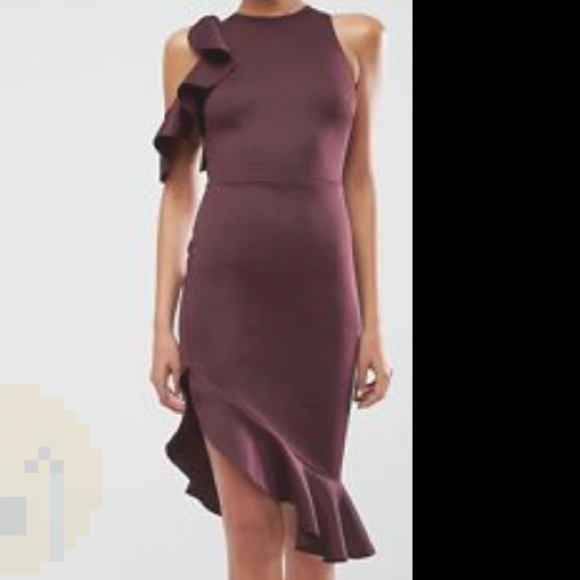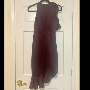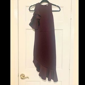 (Worn once) Plum colored ASOS ruffle dress that hits right above the knee at the shorter side and the ruffles on the longer hit right below (I’m 5’3). Extremely comfortable and has a lot of give. Zip closure in the back.