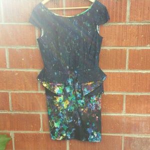 Beautiful lace and water color pattern. Cut out at the back. Side zipper. Fits more like a size 12. Comes from a smoke free home. Feel free to ask any questions.