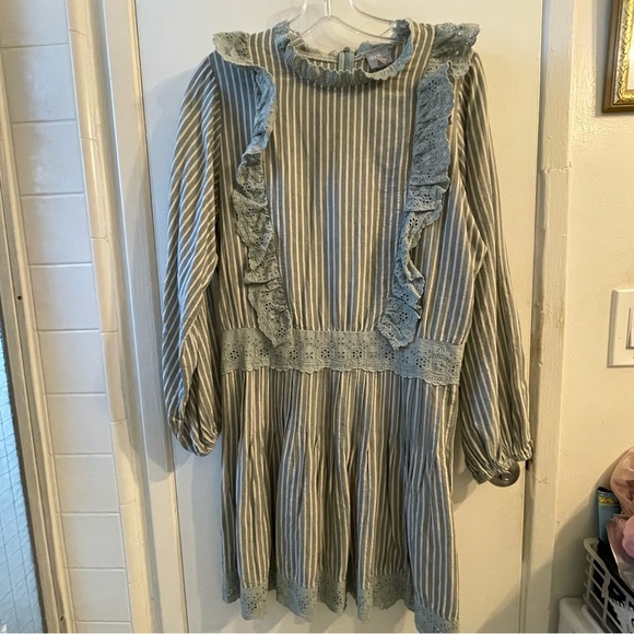 Super cute cottage core dress with pintuck detailing. 15” flat waist measurement.