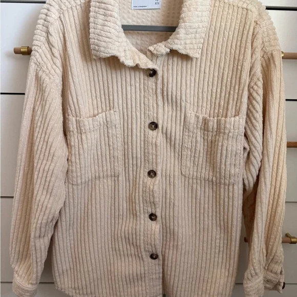 Cream ribbed jacket with button closure. Features two front pockets. Long sleeves and collared design.