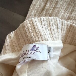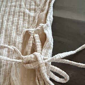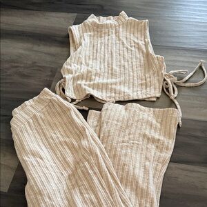 Stylish ribbed knit set with sleeveless top and tie details. Matching pants included.