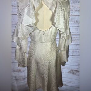 This ASOS dress in a soft cream hue features a romantic ruffled and tiered design, perfect for a bride. The long flutter sleeves and crew neck add a touch of elegance, while the flowing silhouette offers a graceful and timeless appeal.