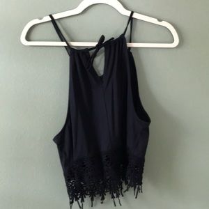 Adjustable crop top with embroidered fringe. Straps tie in the back and are adjustable so it can be worn more like a halter or tank top.