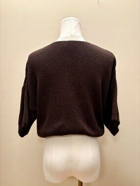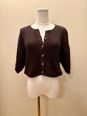 Style: Knit cardigan sweater, loose 3/4 length sleeves, rounded neckline