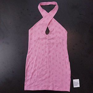 NWT ASOS DESIGN eyelet mini body-conscious dress with cross front in bubblegum pink size US 8. Only worn once to try on. Has small holes all over except the chest is lined. Belt not for sale, only pictured for style inspo.