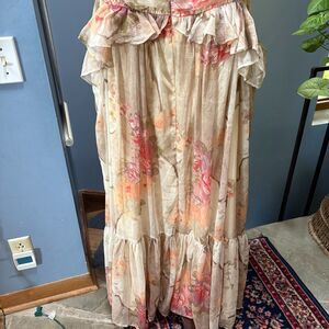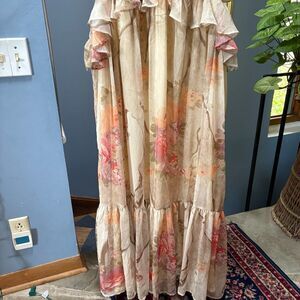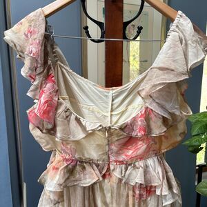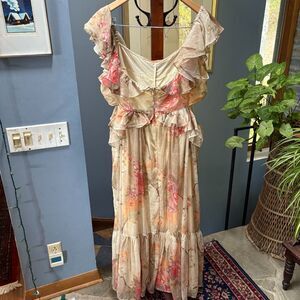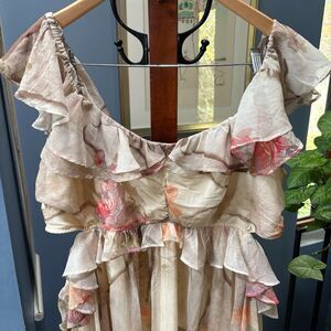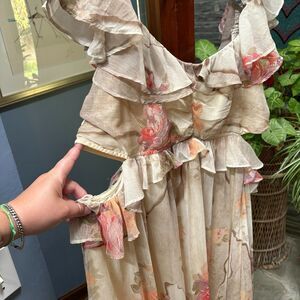A beautiful dress for a wedding guest or to wear for a semi-formal occasion. The dusty floral print is understated and warm and paired with the ruffles, off the shoulder neckline, cutouts and flowy body, it's very flattering and fun to wear dancing.