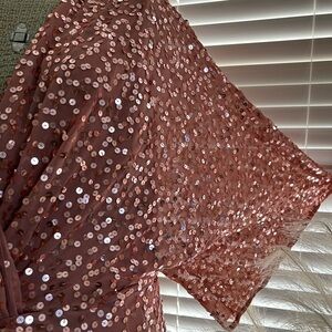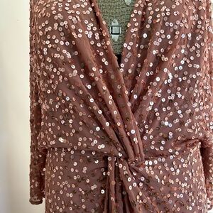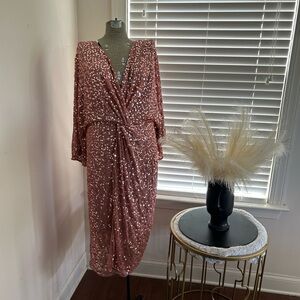 Stunning sequin midi dress. Features shimmering rose gold sequins. Elegant and eye-catching design.