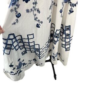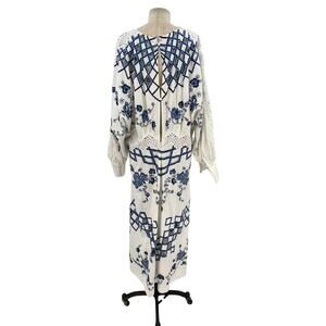 Elegant white maxi dress with blue floral and geometric patterns. Long sleeves with gathered cuffs. Perfect for special occasions.