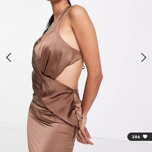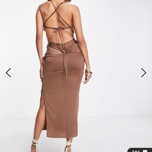 Brown halter backless midi dress w/ cut-out, satin-style fabric - worn once! Size 2 - perfect condition