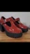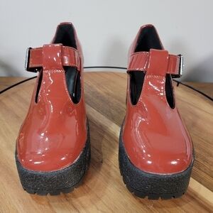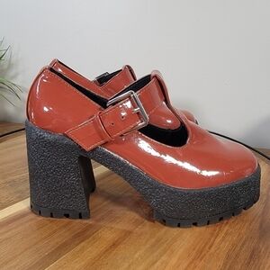 Rusty brown patent faux leather t strap Mary Jane chunky heel shoes.
