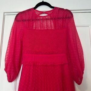 This beautiful dress is fully lined, except for the sleeves which are sheer and amazing. Smocked bodice, beautiful pleated detail on the skirt. Wear to a wedding night out dress it up or down. Such a cute summer dress!