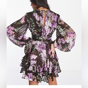 ASOS DESIGN button front brown floral mini dress in satin stripe long sleeve 10