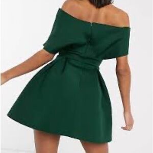 ASOS DESIGN fallen shoulder skater mini dress with tie detail in forest green