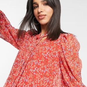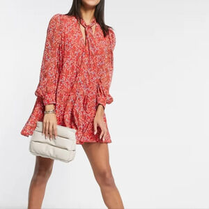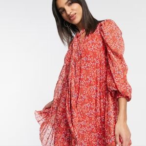 ASOS DESIGN pleated trapeze textured mini dress with neck tie in red floral
