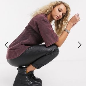 Has a small bleach stain on it, which only shows up as a light purple pink speck on it, personally I thought it added to the color and textured pattern
