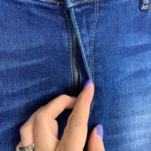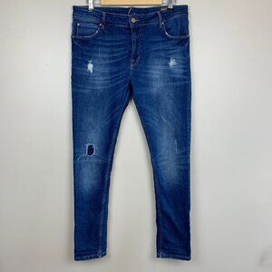 ASOS Denim Distressed Medium Wash Skinny Jean - Fits Like a Size 14. Zip fly, distressed front. In excellent condition. Tag says fits a 36" waist, but measures at 34" Not true to size. See approximate measurements for sizing purposes.