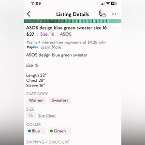 ASOS Design Blue Green Sweater Size 16” Length 22” Chest 28”