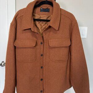 Combining classic utility with modern comfort, this camel brown wool-blend shirt jacket is a versatile layering piece perfect for cooler weather. Featuring a structured silhouette with a cozy quilted lining, it's designed to offer both warmth and understated style.