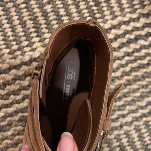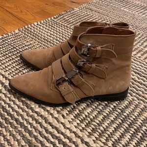 Size 7, tan suede buckled boots. Worn a few times but in great condition.