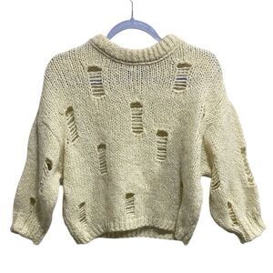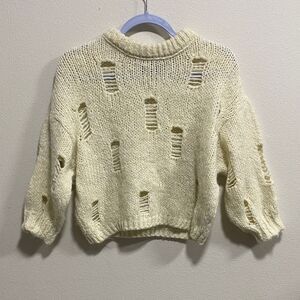 Chunky knit cream sweater with intentional distressed ladder holes throughout for a grunge-inspired look. Features a ribbed crew neckline, hem, and cuffs. Soft acrylic blend, cozy yet lightweight.