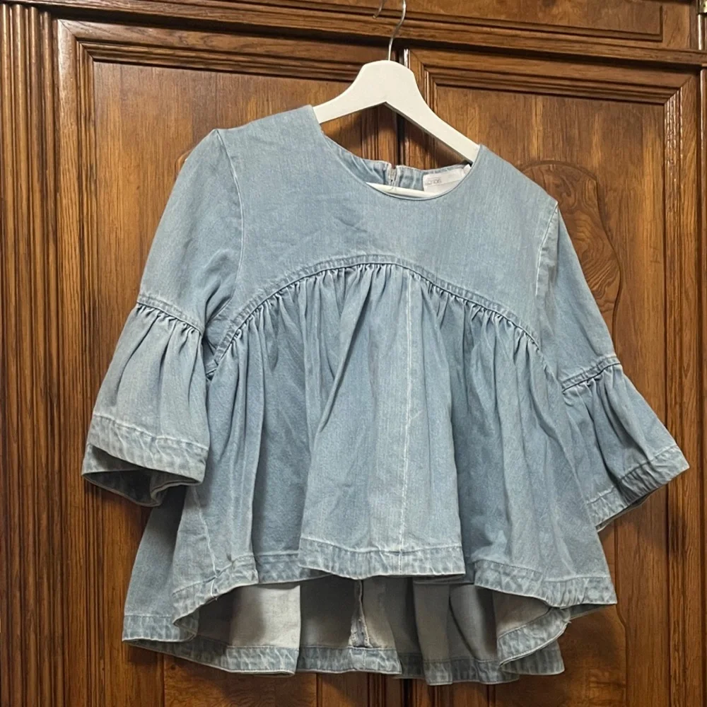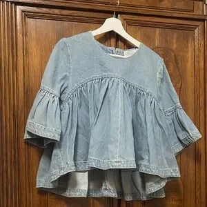 Stylish ASOS Design light blue denim top with ruffle sleeves and peplum waist. Perfect for fall. Can be paired with a sheer top underneath for contrast and worn with leggings or skirt. Zipper at back. Item is very stylish and can be worn multiple ways. Great quality.