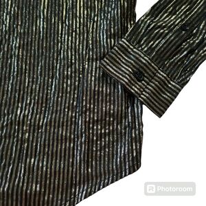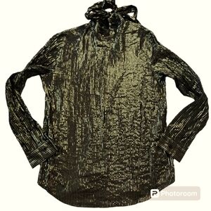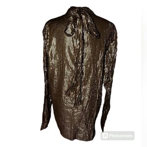 ASOS Design Gold and Black Tie Bow Neck Blouse sz Large. Super lightweight, semi sheer top with zipper back that has a tie on the back of the neck. Higher neck, button cuffs. Super cute dressed up or down. Good used condition, don't see any holes or stains. Flat measurements approximately